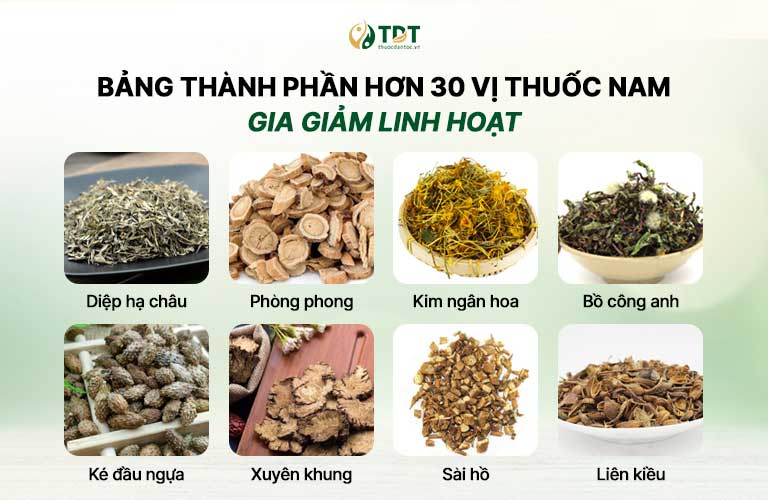 Bài thuốc mề đay Thuốc Dân Tộc phối ngũ hơn 30 vị thuốc Nam có tác dụng tiêu độc, tiêu ban ngứa, điều hòa cơ thể, xử lý mề đay từ căn nguyên. Một số chủ dược như: Kim ngân hoa, bồ công anh, phòng phong, xuyên khung, bách bộ, đơn đỏ, ké đầu ngựa… cùng nhiều vị thuốc Nam và bí dược của người bản địa khác.